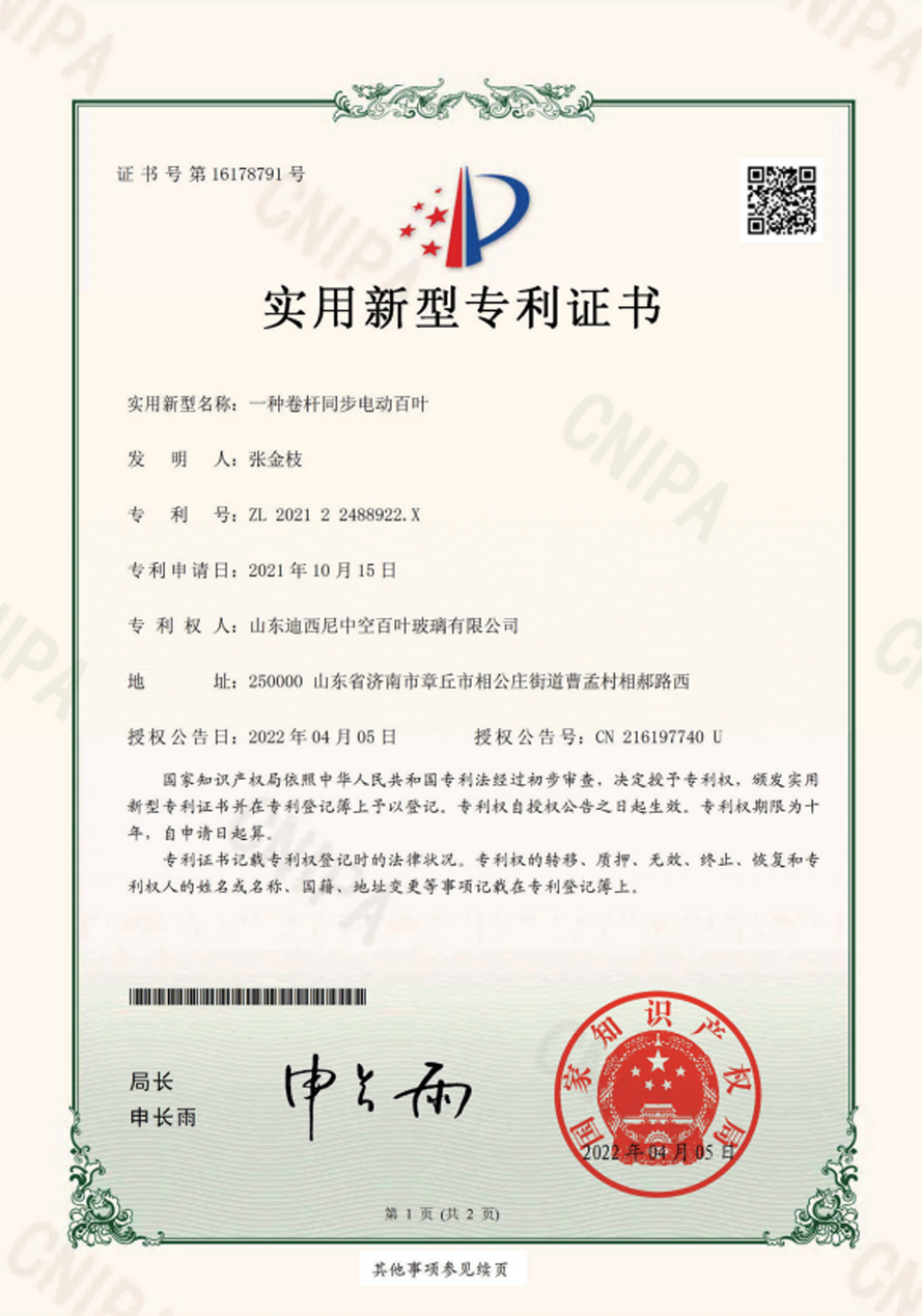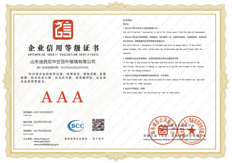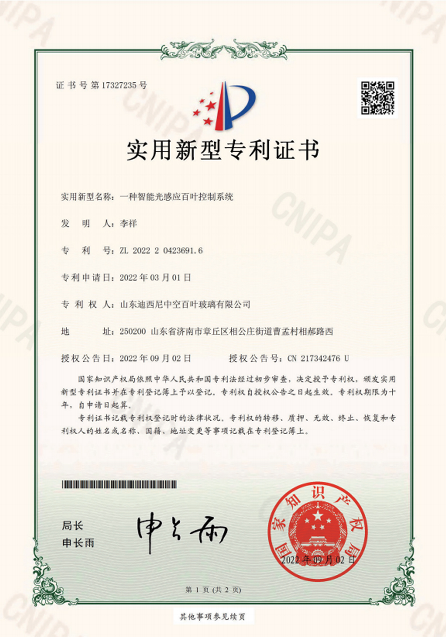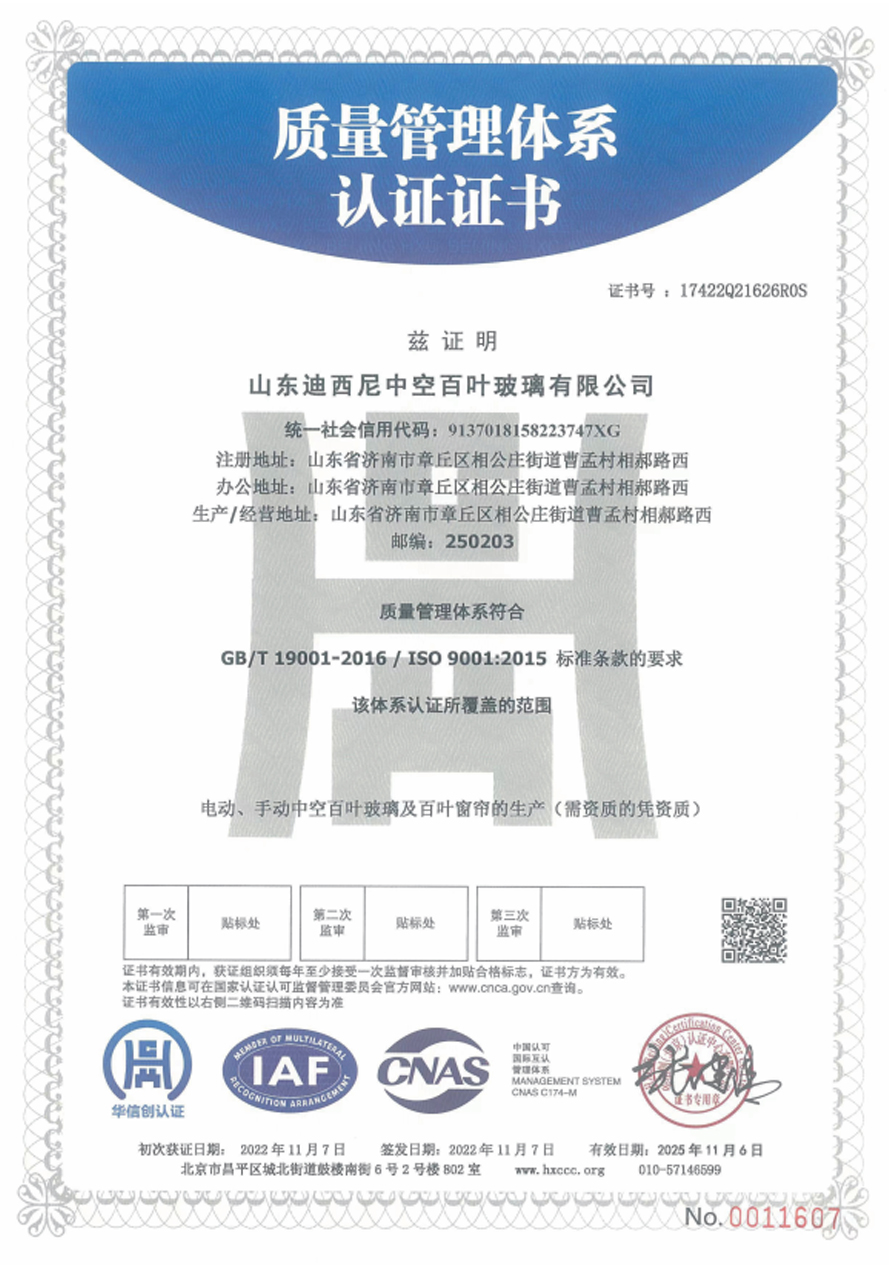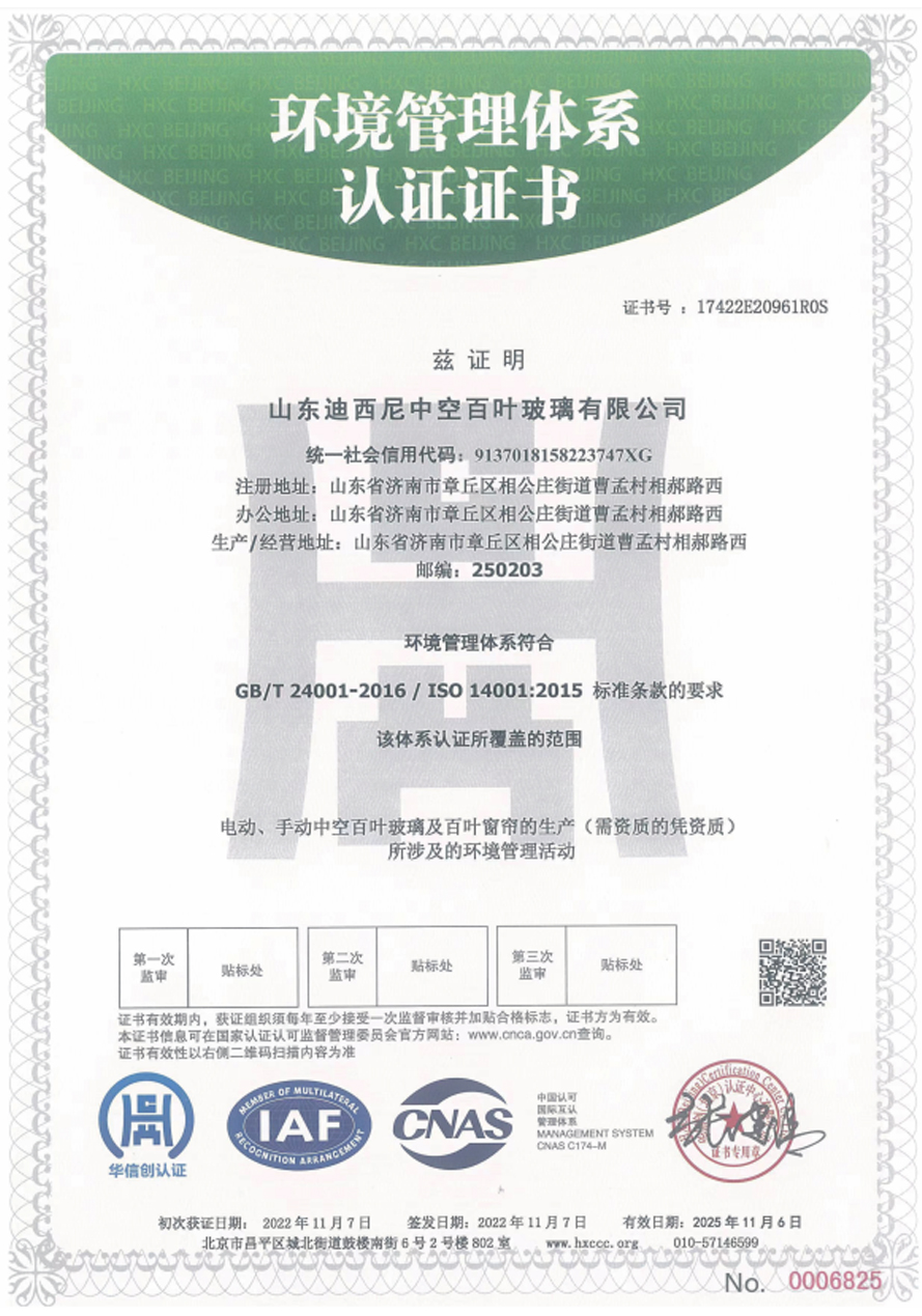 山东迪西尼中空百叶玻璃有限公司通过中国国家强制性产品认证、ISO9001质量管理体系认证、ISO14001环境管理体系认证、ISO45001职业健康安全管理体系认证、上海市建设工程材料备案证。