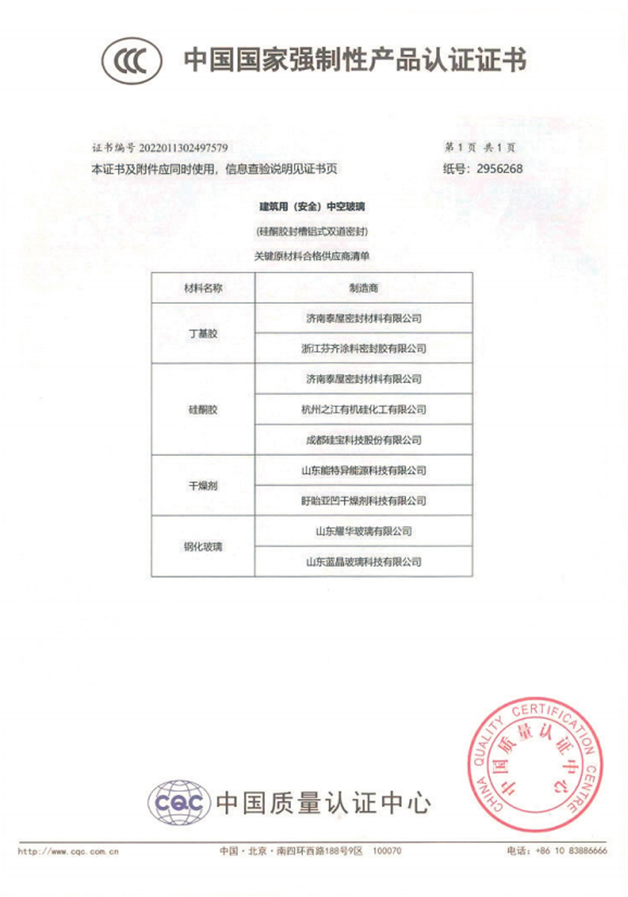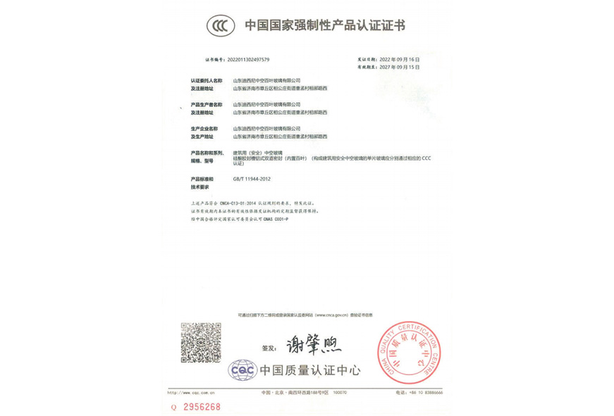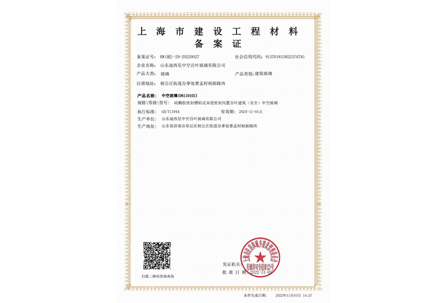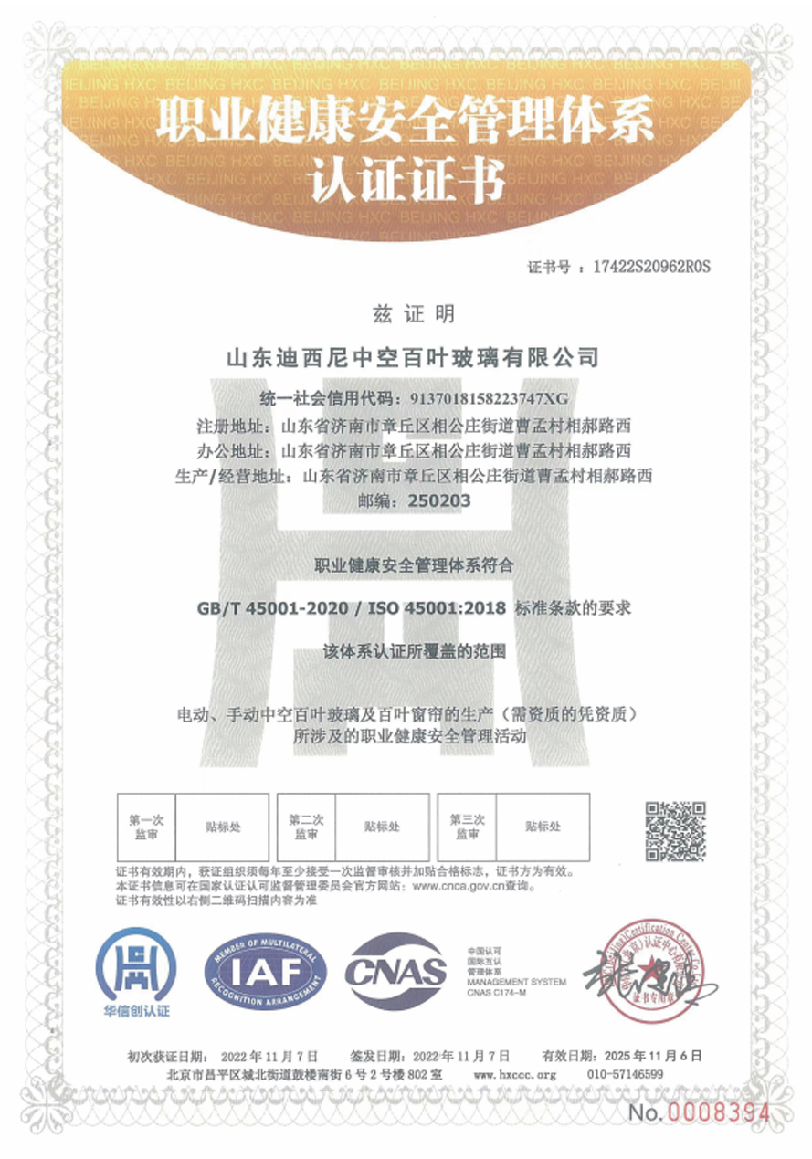 山东迪西尼中空百叶玻璃有限公司通过中国国家强制性产品认证、ISO9001质量管理体系认证、ISO14001环境管理体系认证、ISO45001职业健康安全管理体系认证、上海市建设工程材料备案证。